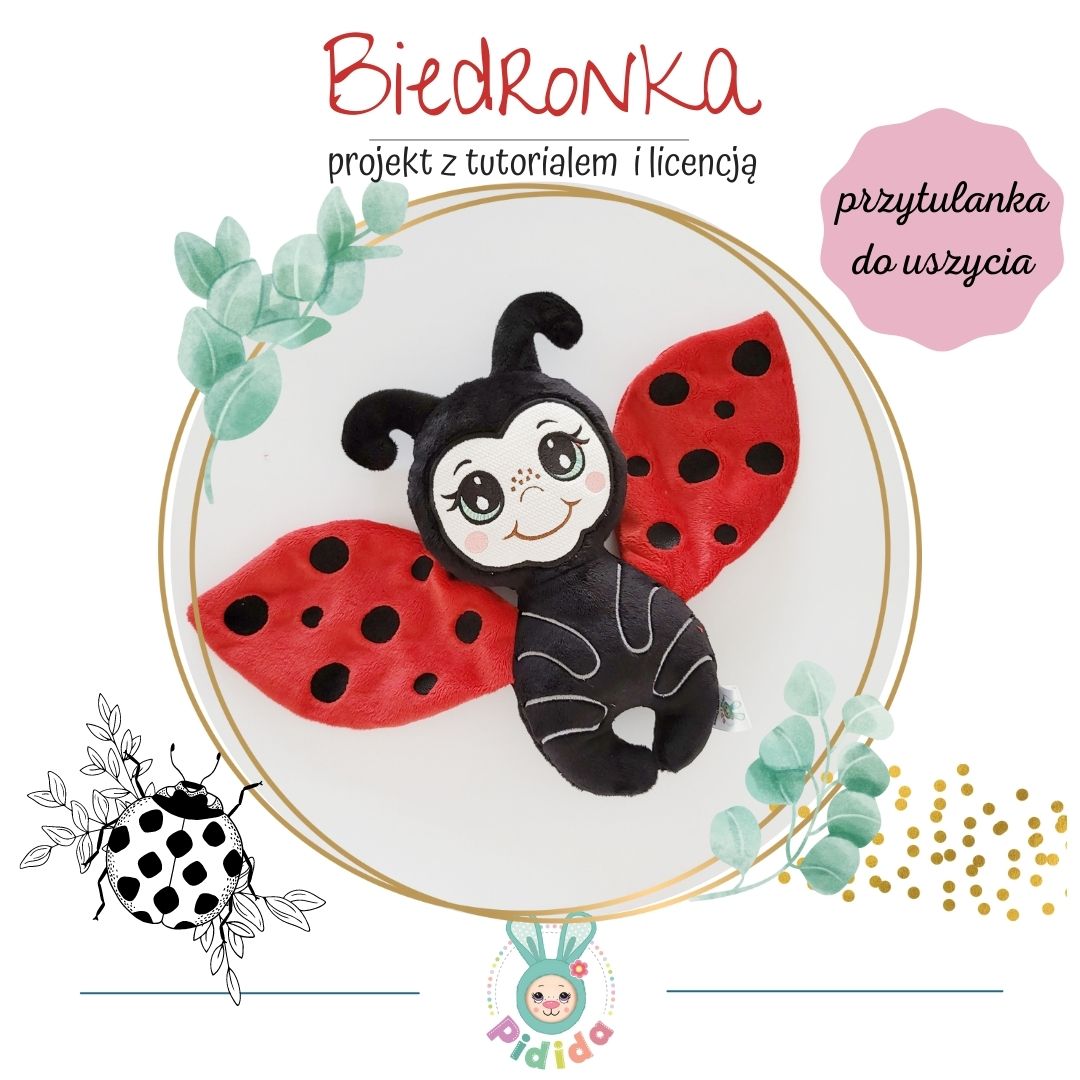 - dodatkowe pliki skrzydeł na osobnym tamborku również są w odpowiadających plikom biedronkę rozmiarach, pliki do uszycia czułek (1 sztuka lub na cztery maskotki od razu).