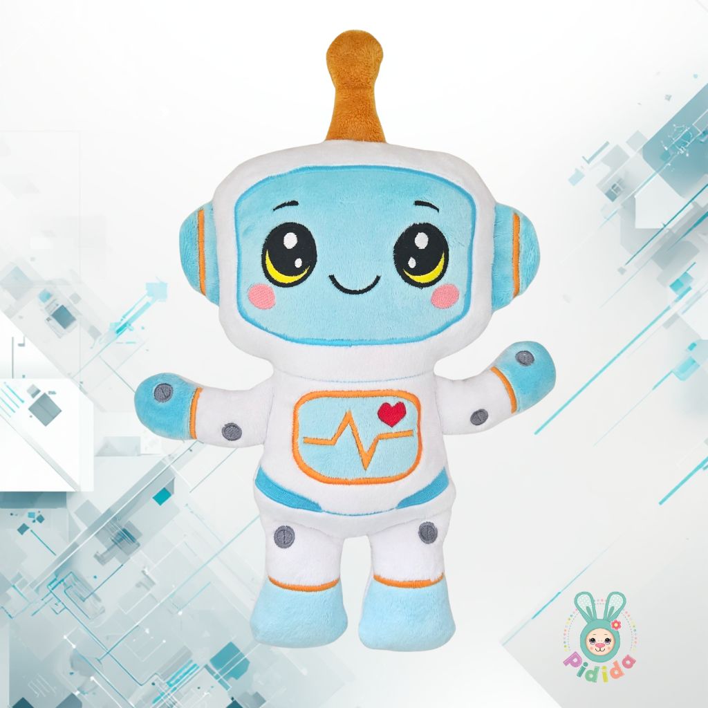 Mały robot–przytulas gotowy na międzygwiezdne przygody! Ten miękki towarzysz ma jasną obudowę z turkusowym „ekranem” twarzy, na którym świecą duże, błyszczące oczy i pogodny uśmiech. Na górze czuwa antenka, jakby odbierała sygnały z odległych galaktyk, a po bokach głowy znajdują się okrągłe sensory przypominające słuchawki — idealne do nasłuchiwania sekretów i dziecięcych marzeń. Na jego klatce piersiowej widnieje panel z linią pulsu i serduszkiem, sugerujący, że ten robot został zaprogramowany do opieki i przytulania. Choć wygląda jak mały odkrywca kosmosu, jego najważniejszą misją jest bycie najlepszym kompanem do snu. To co, uszyjesz własnego robota–strażnika?